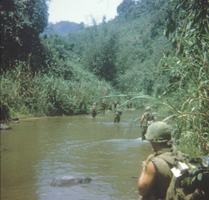 | Marines of Mike Company, 3rd Battalion, 3rd Marines, on patrol near Con Thien, 1968. Photo by Ken George. |